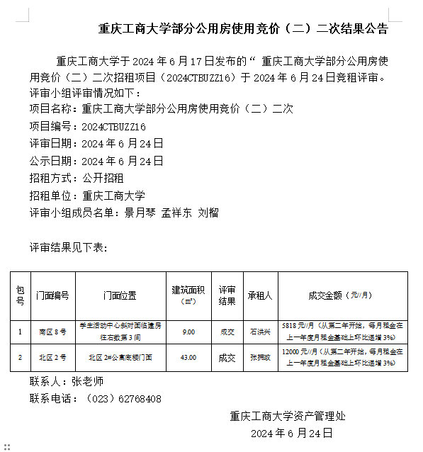 2138CC太阳集团部分公用房使用竞价(二)二次结果公告