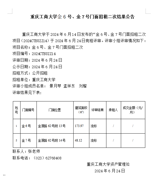 2138CC太阳集团金6号、金7号门面招租三次结果公告