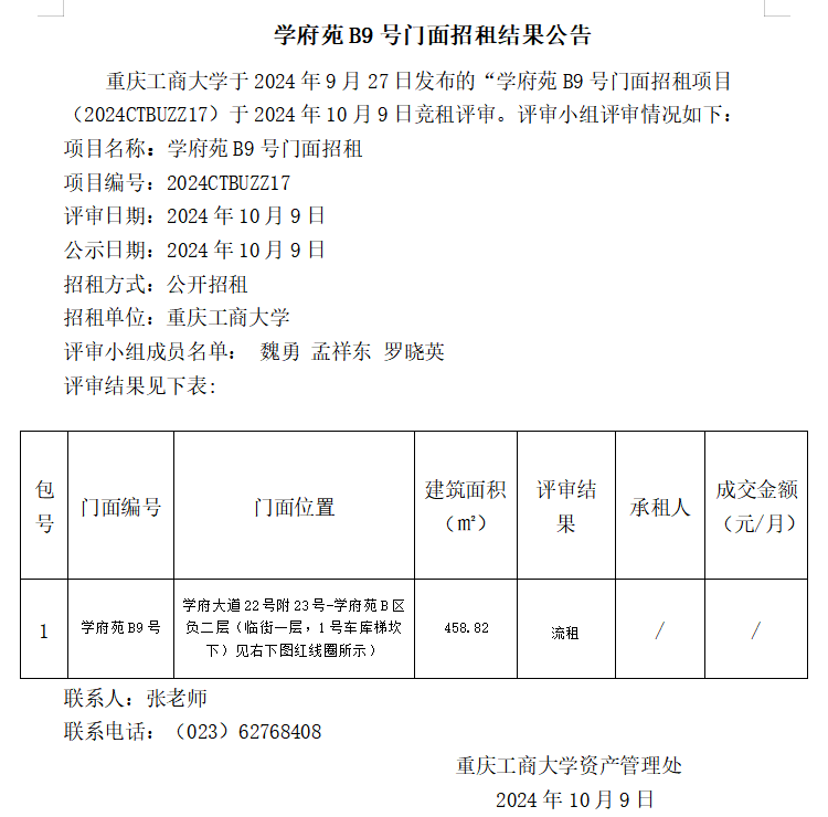 学府苑B9号门面招租结果公告