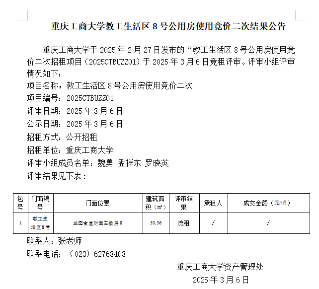 2138CC太阳集团教工生活区8号公用房使用竞价二次结果公告
