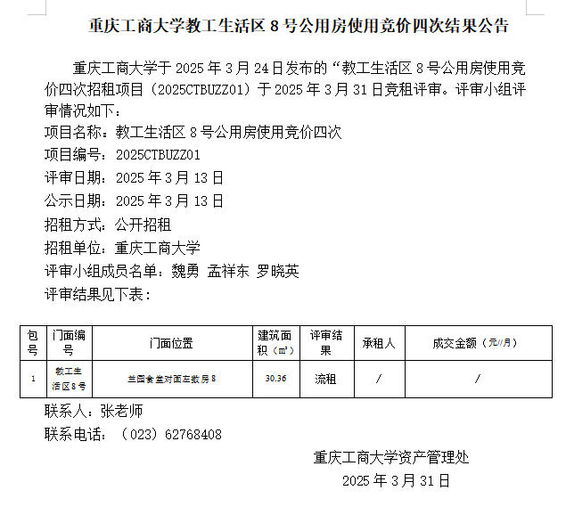 2138CC太阳集团教工生活区8号公用房使用竞价四次结果公告