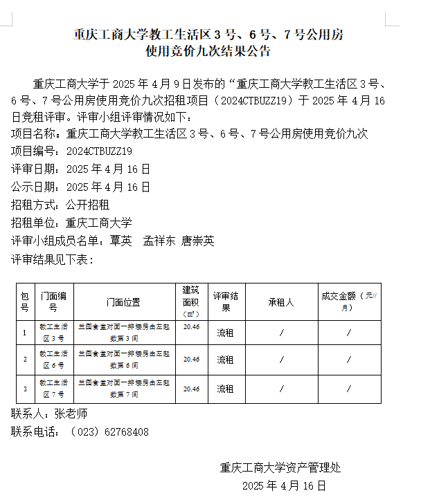 2138CC太阳集团教工生活区3号、6号、7号公用房 使用竞价九次结果公告