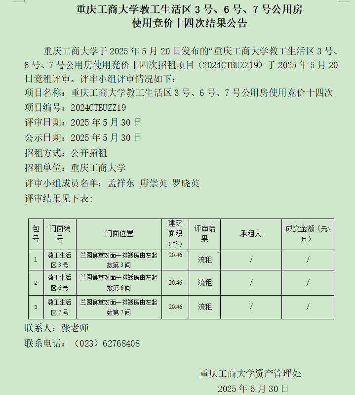 2138CC太阳集团教工生活区3号、6号、7号公用房 使用竞价十五次结果公告